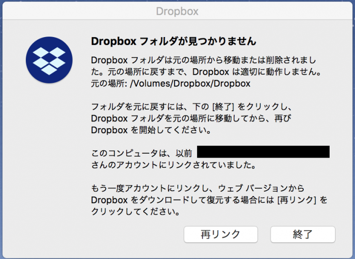 HDDがマウントされていないので、DropBoxのリンク先が見つからないのは当然のことで以下のようなエラーが表示されます。